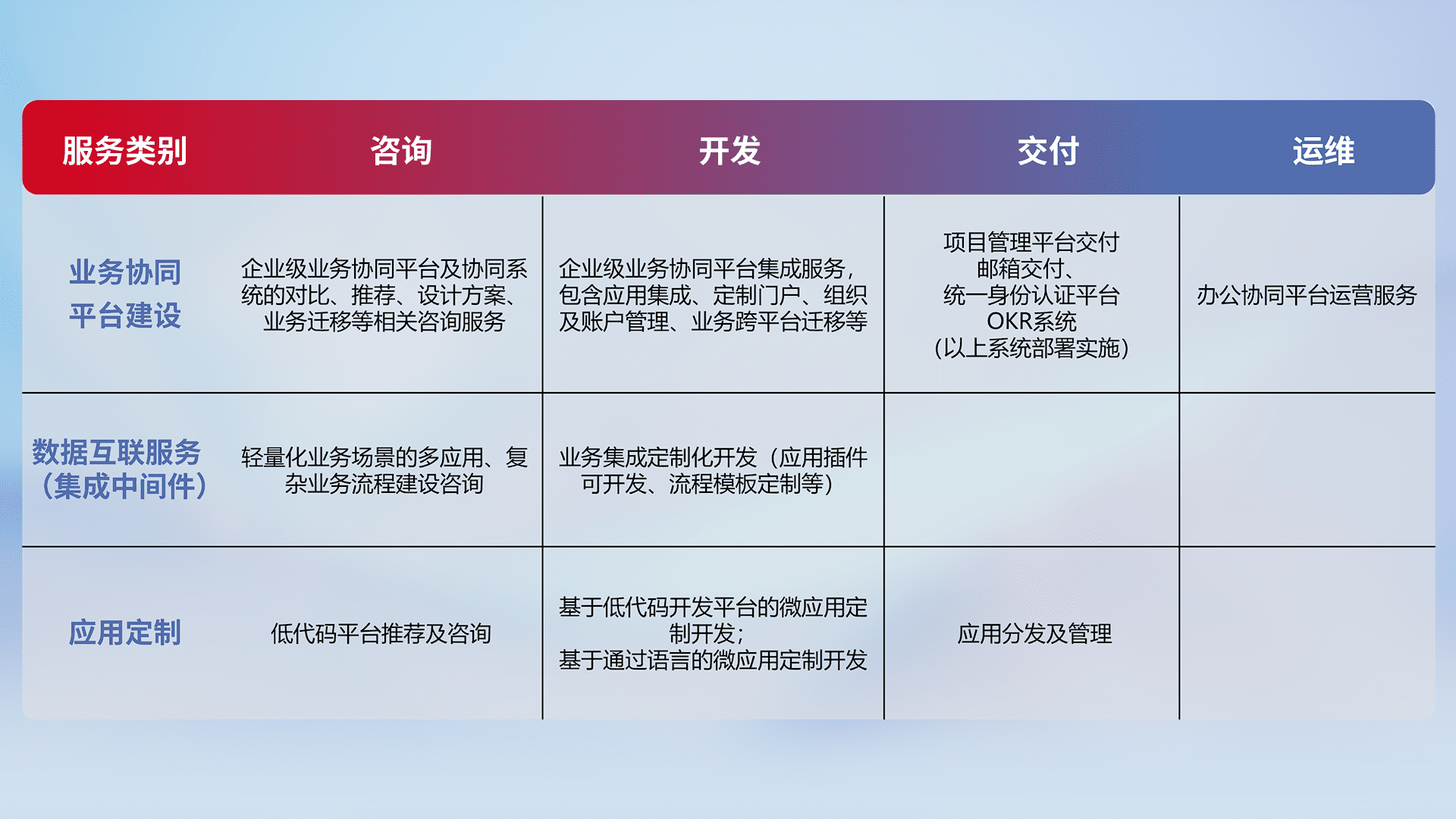针对钉钉、、、、企微、、、、IDaas等平台级产品提供产品的规划、、、、方案、、、、交付、、定制化开发等服务,,,实现如统一协同办公、、、智能客户服务、、、、混合会议管理、、智能数据查询、、、等业务场景,,,,实现数字化转型。。。。
